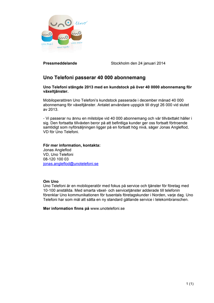 Uno Telefoni stängde 2013 med en kundstock på över 40 0000 abonnemang för växeltjänster.