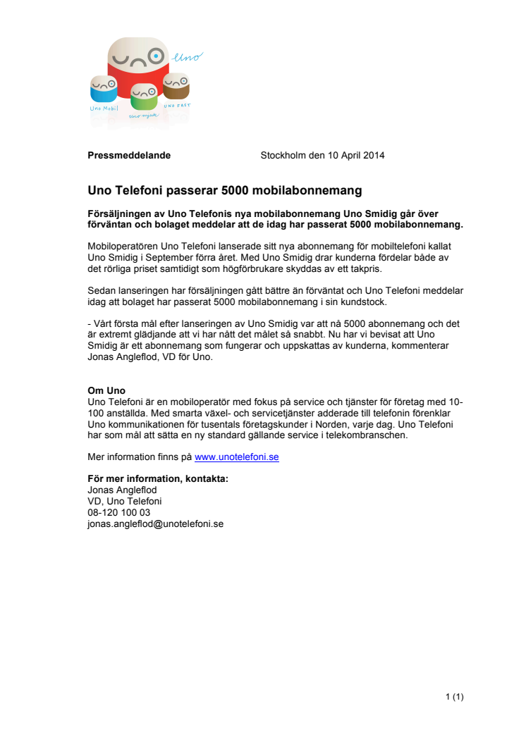 Försäljningen av Uno Telefonis nya mobilabonnemang Uno Smidig går över förväntan och bolaget meddelar att de idag har passerat 5000 mobilabonnemang.