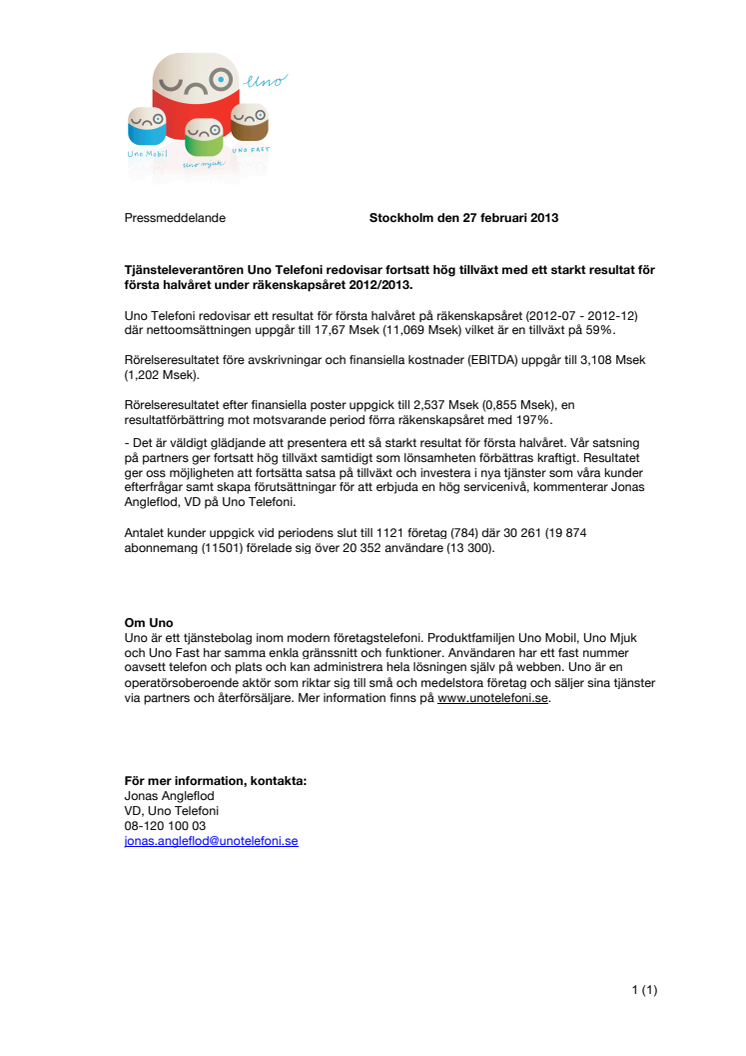 Tjänsteleverantören Uno Telefoni redovisar fortsatt hög tillväxt med ett starkt resultat för första halvåret under räkenskapsåret 2012/2013.