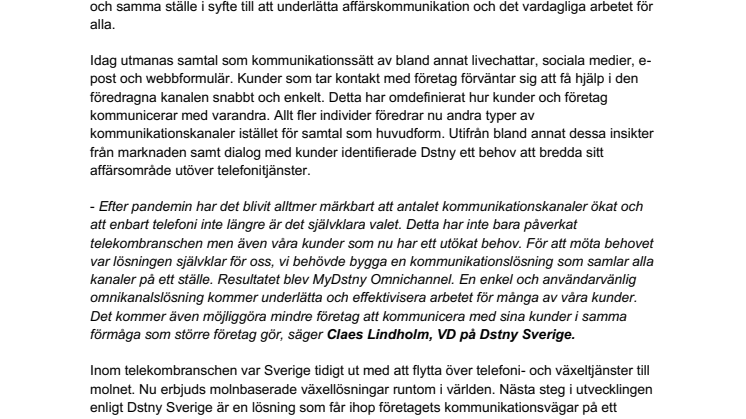 - Efter pandemin har det blivit alltmer märkbart att antalet kommunikationskanaler ökat och att enbart telefoni inte längre är det självklara valet. Detta har inte bara påverkat telekombranschen men även våra kunder som nu har ett utökat behov. För att möta behovet var lösningen självklar för oss, vi behövde bygga en kommunikationslösning som samlar alla kanaler på ett ställe. Resultatet blev MyDstny Omnichannel. En enkel och användarvänlig omnikanalslösning kommer underlätta och effektivisera arbetet för många av våra kunder. Det kommer även möjliggöra mindre företag att kommunicera med sina kunder i samma förmåga som större företag gör, säger Claes Lindholm, VD på Dstny Sverige.