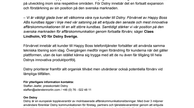 – Vi är väldigt glada över att välkomna våra nya kunder till Dstny. Förvärvet av Happy Boss ABs kundbas ligger i linje med vår satsning på att erbjuda den senaste och mest innovativa affärskommunikationen till en allt större kundbas. Samtidigt stärker vi vår position på den svenska marknaden för affärskommunikation genom fortsatta förvärv, säger Claes Lindholm, VD för Dstny Sverige.