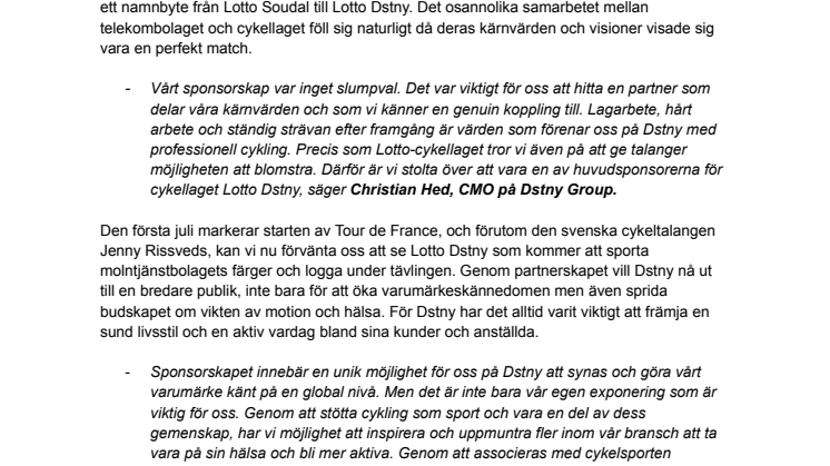 – Vårt sponsorskap var inget slumpval. Det var viktigt för oss att hitta en partner som delar våra kärnvärden och som vi känner en genuin koppling till. Lagarbete, hårt arbete och ständig strävan efter framgång är värden som förenar oss på Dstny med professionell cykling. Precis som Lotto-cykellaget tror vi även på att ge talanger möjligheten att blomstra. Därför är vi stolta över att vara en av huvudsponsorerna för cykellaget Lotto Dstny, säger Christian Hed, CMO på Dstny Group.