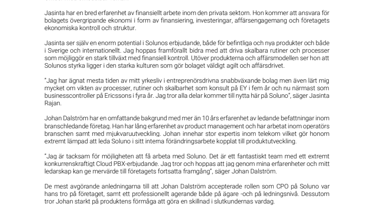 ”Jag är tacksam för möjligheten att få arbeta med Soluno. Det är ett fantastiskt team med ett extremt konkurrenskraftigt Cloud PBX-erbjudande. Jag tror och hoppas att jag genom mina erfarenheter och mitt ledarskap kan ge mervärde till företagets fortsatta framgång”, säger Johan Dalström.