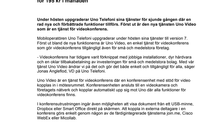 Mobiloperatören Uno Telefoni uppgraderar under hösten sina tjänster till version 7. Först ut bland de nya funktionerna är Uno Video, en enkel tjänst för videokonferens som gör videokonferens tillgängligt även för små och medelstora företag.