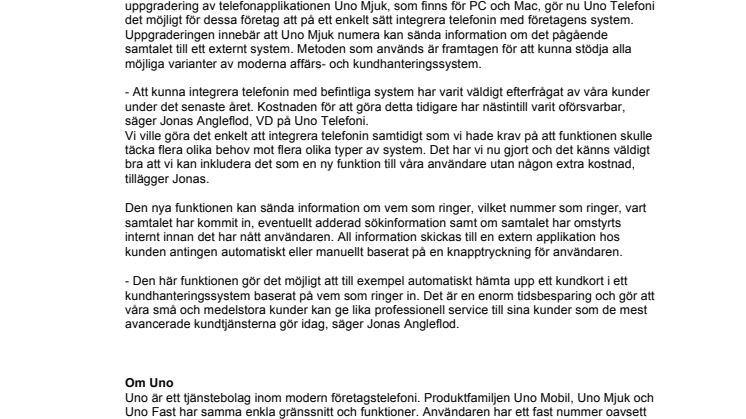 Kostnaden för att integrera telefonin med ett befintligt affärs- eller kundhanteringssystem har under en lång tid varit svår att räkna hem för små och medelstora företag. Genom en uppgradering av telefonapplikationen Uno Mjuk, som finns för PC och Mac, gör nu Uno Telefoni det möjligt för dessa företag att på ett enkelt sätt integrera telefonin med företagens system. Uppgraderingen innebär att Uno Mjuk numera kan sända information om det pågående samtalet till ett externt system. Metoden som används är framtagen för att kunna stödja alla möjliga varianter av moderna affärs- och kundhanteringssystem.