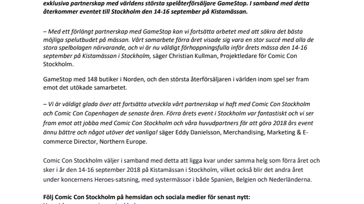 – Med ett förlängt partnerskap med GameStop kan vi fortsätta arbetet med att säkra det bästa möjliga spelutbudet på mässan. Vårt samarbete förra året visade sig vara en stor succé med alla de stora spelbolagen närvarande, och vi är nu väldigt förhoppningsfulla inför årets mässa den 14-16 september på Kistamässan i Stockholm, säger Christian Kullman, Projektledare för Comic Con Stockholm.