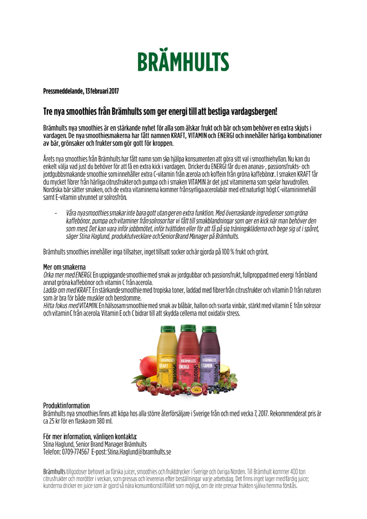 Brämhults nya smoothies är en stärkande nyhet för alla som älskar frukt och bär och som behöver en extra skjuts i vardagen. De nya smoothiesmakerna har fått namnen KRAFT, VITAMIN och ENERGI och innehåller härliga kombinationer av bär, grönsaker och frukter som gör gott för kroppen.