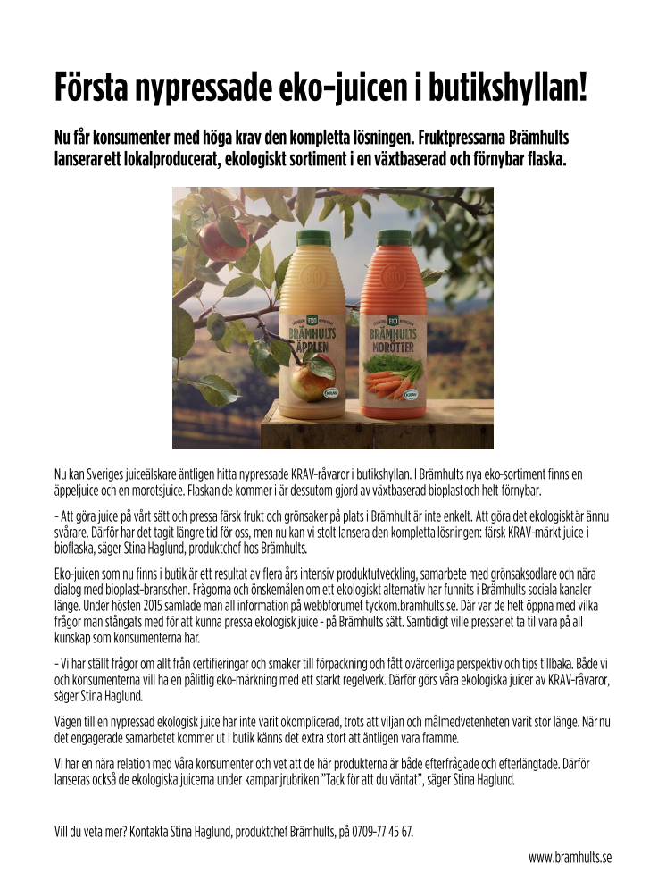 - Att göra juice på vårt sätt och pressa färsk frukt och grönsaker på plats i Brämhult är inte enkelt. Att göra det ekologiskt är ännu svårare. Därför har det tagit längre tid för oss, men nu kan vi stolt lansera den kompletta lösningen: färsk KRAV-märkt juice i bioflaska, säger Stina Haglund, produktchef hos Brämhults.