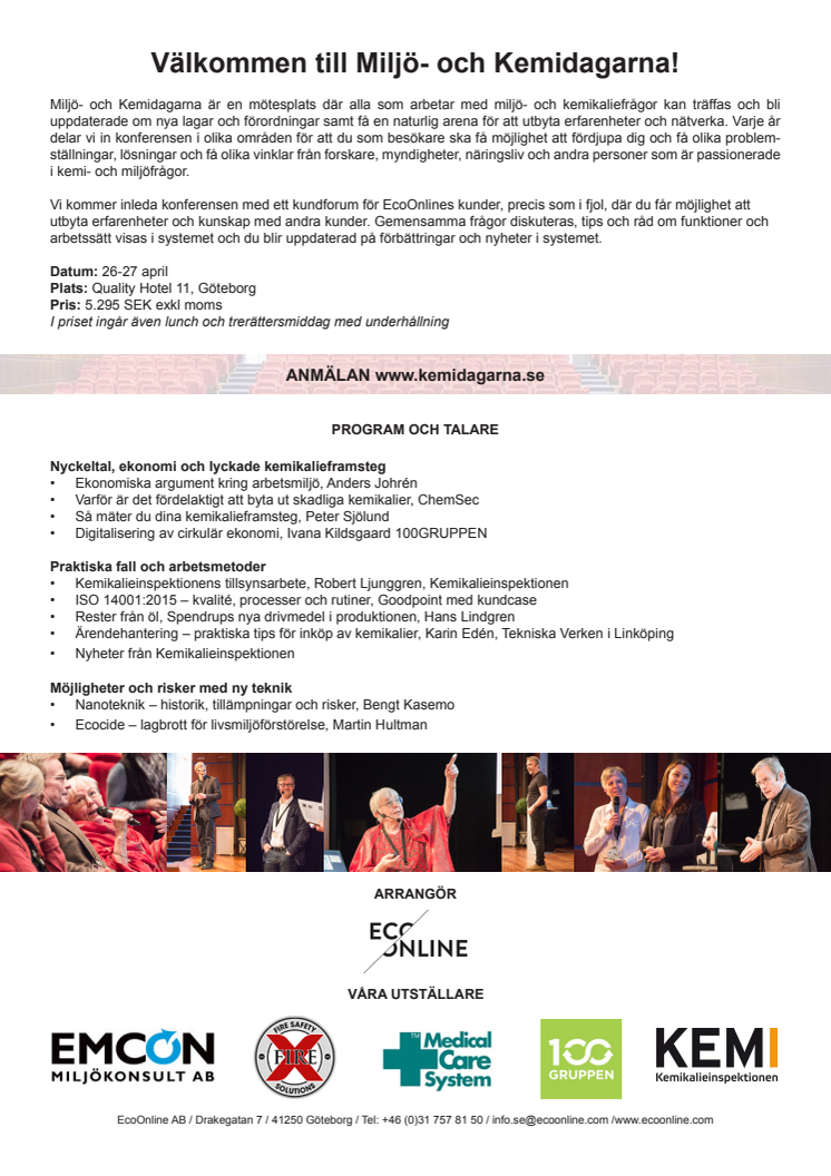 EcoOnline arrangerar Miljö- och Kemidagarna för att skapa en mötesplats där alla som arbetar med miljö-, och kemikalie- och arbetsmiljöfrågor kan träffas och bli uppdaterade om nya lagar och förordningar samt få en naturlig arena för att utbyta erfarenheter och nätverka. I år äger konferensen rum den 26-27 april i på Quality Hotell 11 i Göteborg.
