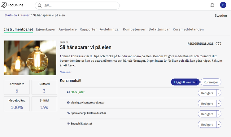 Kursexempel Spara Energi i EcoOnlines utbildningsplattform Learning Manager
