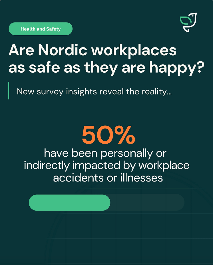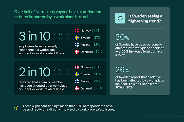 Undersökningen ”Hur säker och hållbar är din arbetsplats?”, baserad på insikter från 3 600+ anställda i Sverige, Norge, Finland och Danmark, fann att hälften av alla arbetstagare har påverkats direkt eller indirekt av arbetsplatsolyckor eller arbetsrelaterade sjukdomar. Trots att de har några av världens mest omfattande regelverk för arbetsmiljö visar resultaten att det fortfarande finns utrymme för förbättringar när det gäller säkerheten på arbetsplatsen.