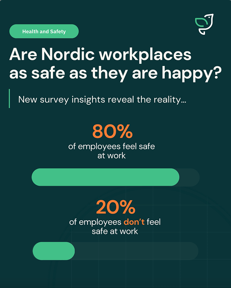 De nordiska länderna toppar konsekvent globala välfärdsindex, och denna känsla av trygghet återspeglas delvis på arbetsplatserna, där 80 % av de anställda känner sig trygga på jobbet. Ändå återstår 20 procent som inte gör det. Norge är ledande i regionen med 83 % av den upplevda säkerheten och här anger 74 % att deras arbetsgivare har ett engagemang i säkerhetsfrågor på arbetsplatsen. En indikator på att det finns en stark säkerhetskultur.