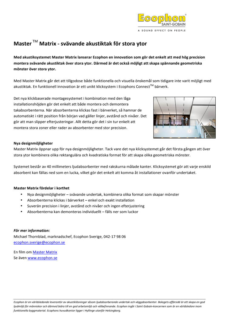 Nya Master Matrix tillgodoser både funktionella och visuella önskemål som tidigare inte varit möjligt med akustiktak. Ett nytt unikt klicksystem i Ecophons ConnectTM bärverk gör det enkelt att både montera och demontera akustiktaken över stora ytor. Nu går det att kombinera olika rektangulära och kvadratiska format för att skapa olika geometriska mönster över stora ytor .