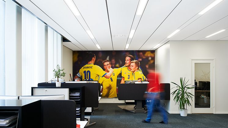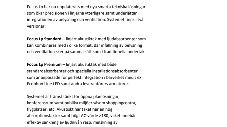 Focus Lp Standard – linjärt akustiktak med ljudabsorbenter som kan kombineras med i olika format, där infällning av belysning och ventilation sker på samma sätt som i traditionella undertak.