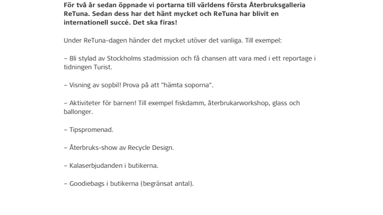 För två år sedan öppnade vi portarna till världens första Återbruksgalleria ReTuna. Sedan dess har det hänt mycket och ReTuna har blivit en internationell succé. Det ska firas!