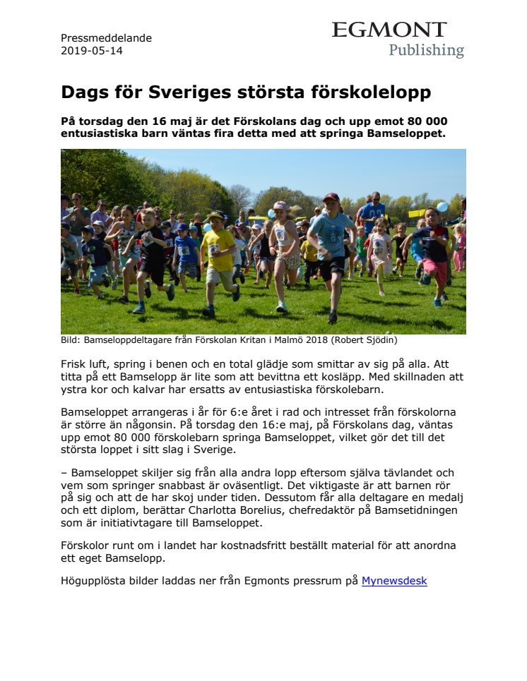 På torsdag den 16 maj är det Förskolans dag och upp emot 80 000 entusiastiska barn väntas fira detta med att springa Bamseloppet.