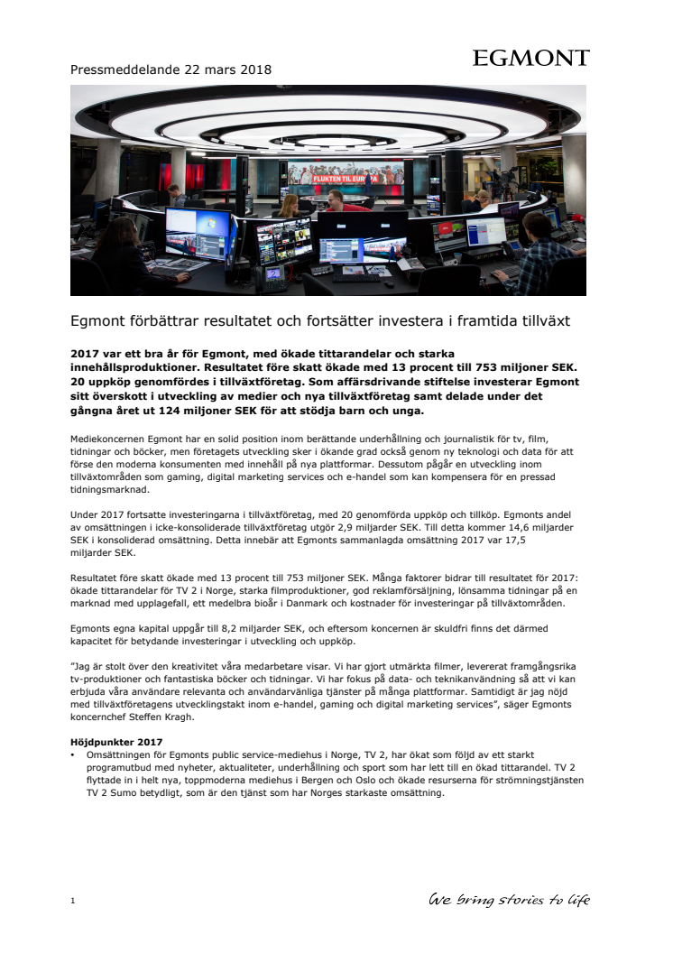 2017 var ett bra år för Egmont, med ökade tittarandelar och starka innehållsproduktioner. Resultatet före skatt ökade med 13 procent till 753 miljoner SEK. 20 uppköp genomfördes i tillväxtföretag. Som affärsdrivande stiftelse investerar Egmont sitt överskott i utveckling av medier och nya tillväxtföretag samt delade under det gångna året ut 124 miljoner SEK för att stödja barn och unga.