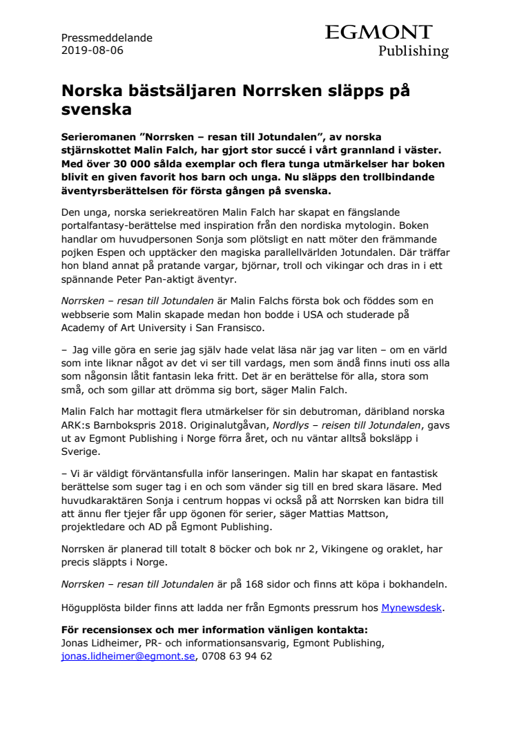 Serieromanen ”Norrsken – resan till Jotundalen”, av norska stjärnskottet Malin Falch, har gjort stor succé i vårt grannland i väster. Med över 30 000 sålda exemplar och flera tunga utmärkelser har boken blivit en given favorit hos barn och unga. Nu släpps den trollbindande äventyrsberättelsen för första gången på svenska.