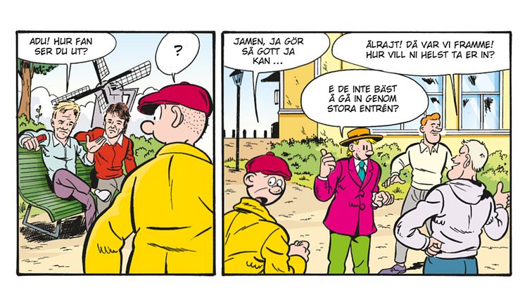 – "Storstadsweekend" är en klassisk fars med förvecklingar och oväntade vändningar. Malmö är en stad som sällan förekommer i tecknade serier, men här får staden chansen att visa upp sig i all sin prakt. Det äts falafel, alla heter Möller, och den ständiga avskedsfrasen är "Sä'r vi!", säger Pidde Andersson.