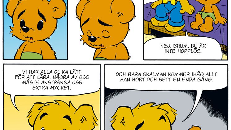 När trillingarna ska göra sin läxa upptäcker Bamse att Brum har tappat motivationen. Brum tycker att han själv är hopplös. Det blir en diskussion om att alla har olika lätt att lära och att vi gör det på olika sätt. I Bamses skola om Studieteknik beskrivs sedan olika metoder som underlättar lärande.
