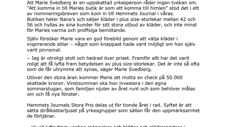 Att Marie Svedberg är en uppskattad yrkesperson råder ingen tvekan om. ”Att komma in till Maries butik är som att komma till himlen” stod det i ett av nomineringsbreven som kom in till Hemmets Journal i våras. Butiken heter Nana’s och säljer kläder i plus size-storlekar mellan 42 och 56 och hyllas av sina kunder för sitt stora utbud av kläder, och inte minst för Maries varma och proffsiga bemötande. Själv försöker Marie vara en god förebild genom att välja kläder i inspirerande stilar – något som knappast hade varit möjligt om hon själv varit pinnsmal. – Jag är otroligt stolt och hedrad över priset. Framför allt har det varit roligt att få lyfta fram betydelsen av plus size-storlekar. Det är inte så ofta som de får utrymme att synas, säger Marie Svedberg. Utöver den stora äran kommer Marie att motta en check på 50 000 skattade kronor. Vinstsumman ska hon investera i den egna sommarstugan, som familjen njuter av året runt och som behöver målas om och få nya fönster. Hemmets Journals Stora Pris delas ut för tionde året i rad. Syftet är att sätta strålkastarljuset på yrkesgrupper som sällan får den uppmärksamhet de förtjänar.
