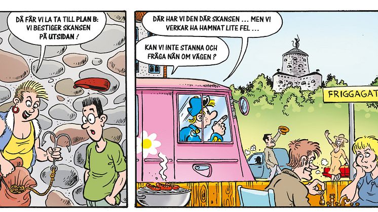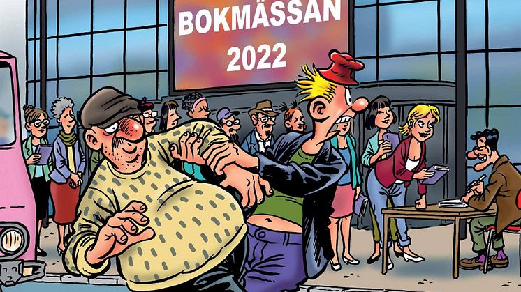Faktum är att 91:an inte är ensam seriefigur att gästa Göteborg i höst. Staden är även spelplats för en aktuell berättelse i klassiska serietidningen Uti Vår Hage, med livskonstnären Faló i centrum. Serien, med titeln ”Bök & Bibliotek”, utspelar sig på självaste Bokmässan. Den produktive manusförfattaren Pidde Andersson ligger bakom även denna serie medan den erfarne tecknaren Patrik Norrman står för bilderna.