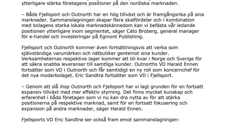 – Både Fjellsport och Outnorth har en hög tillväxt och är framgångsrika på sina marknader. Sammanslagningen skapar flera skalfördelar och i kombination med bolagens starka lokala marknadskännedom kan vi befästa vår ledande positionen ytterligare inom segmentet, säger Cato Broberg, general manager för e-handel och investeringar på Egmont Publishing.