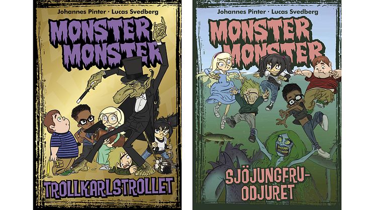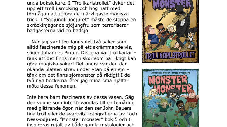 Nu släpps bok 5 och 6 av ”Monster monster” – barnboksserien vars berättarglädje och fantasirikedom har uppskattats av Sveriges unga bokslukare. I ”Trollkarlstrollet” dyker det upp ett troll i smoking och hög hatt med förmågan att utföra de märkligaste magiska trick. I ”Sjöjungfruodjuret” måste de stoppa en skräckinjagande sjöjungfru som terroriserar badgästerna vid en badsjö.