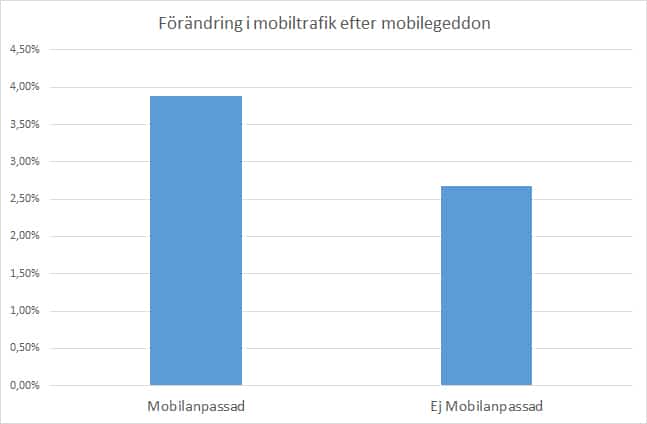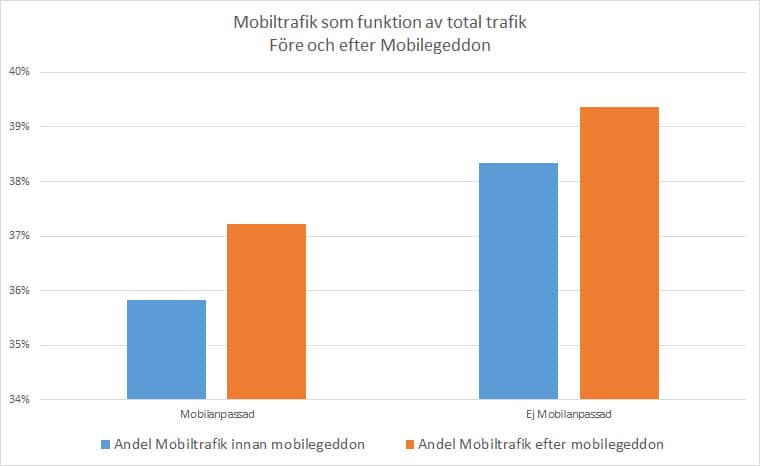 Slutatsen är att mobilegeddon hittills inte påverkat svenska e-handlares trafik utslaget på ett stort urval. Tidsperioden är dock fortfarande ganska liten i sammanhanget och vi lämnar datan med reservationen att ämnet behöver återbesökas inom kort.