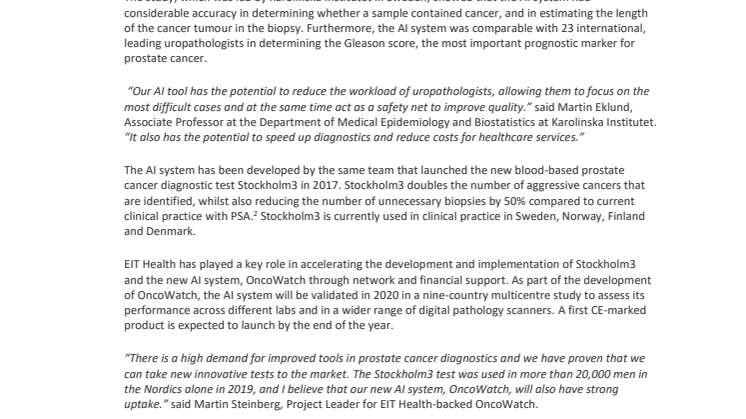 -Artificiell intelligens har en stor potential för den framtida vården och Sverige har en stor möjlighet att ligga i framkant. Resultatet från studien visar den spännande utvecklingen som sker inom AI och hur tekniken kan tillämpas medciniskt. För EIT Health är det viktigt att kunna stödja både Stockholm3 och OncoWatch projekten för att säkerställa klinisk implementering av förbättrade diagnostikverktyg för prostata cancer, säger Erik Forsberg, VD på EIT Health i Skandinavien.