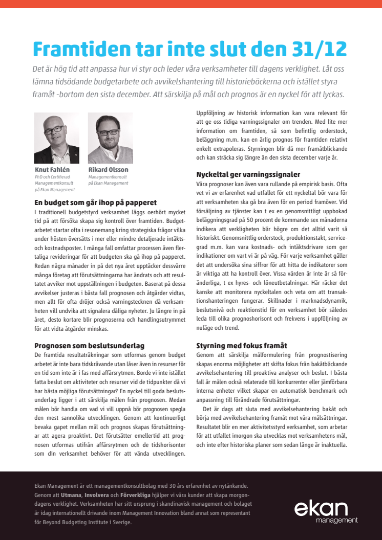 "Det är hög tid att anpassa hur vi styr och leder våra verksamheter till dagens verklighet. Låt oss lämna tidsödande budgetarbete och avvikelshantering till historieböckerna och istället styra framåt -bortom den sista december". Det menar ekonomie doktor Knut Fahlén och Rikard Olsson, managementkonsult med lång erfarenhet från strategi och performance management på AstraZeneca.