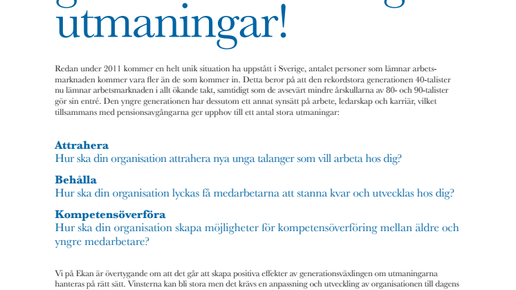 Redan under 2011 kommer en helt unik situation ha uppstått i Sverige, antalet personer som lämnar arbetsmarknaden kommer vara fler än de som kommer in. Detta beror på att den rekordstora generationen 40-talister lämnar arbetsmarknaden i allt ökande takt, samtidigt som de avsevärt mindre årskullarna av 80- och 90-talister gör sin entré. Den yngre generationen har dessutom ett annat synsätt på arbete, ledarskap och karriär, vilket tillsammans med pensionsavgångarna ger upphov till ett antal stora utmaningar: