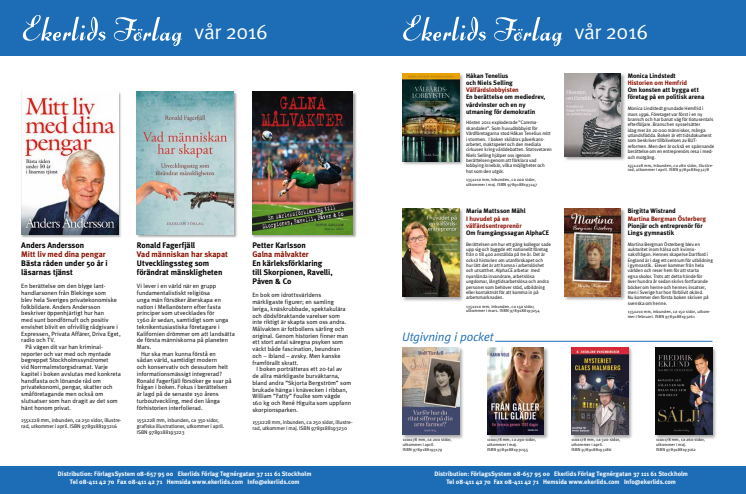 Memoar av Anders Andersson, Ronald Fagerfjäll om evolutionen, historien om Hemfrid och galna målvakter finns bland Ekerlids Förlags utgivning under våren 2016. Håkan Tenelius och Niels Selling beskriver i boken Välfärdslobbyisten påverkansarbetet, maktspelet och den mediala cirkusen kring Carema och vårddebatten. Maria Mattsson Mähl berättar om framgångssagan AplhaCE.