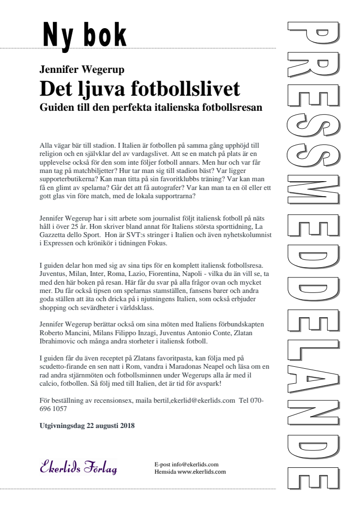 I boken Det ljuva fotbollslivet - guiden till den perfekta italienska fotbollsresan delar Jennifer Wegerup med sig av sina tips för en komplett italiensk fotbollsresa. Juventus, Milan, Inter, Roma, Lazio, Fiorentina, Napoli - vilka du än vill se, ta med den här boken på resan.