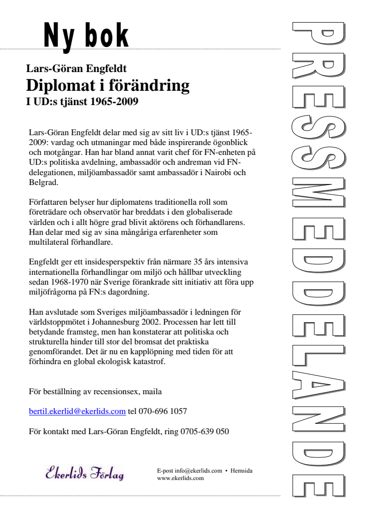 Ny bok: Diplomati i förändring - i UD:s tjänst 1965-2009 av Lars-Göran Engfeldt