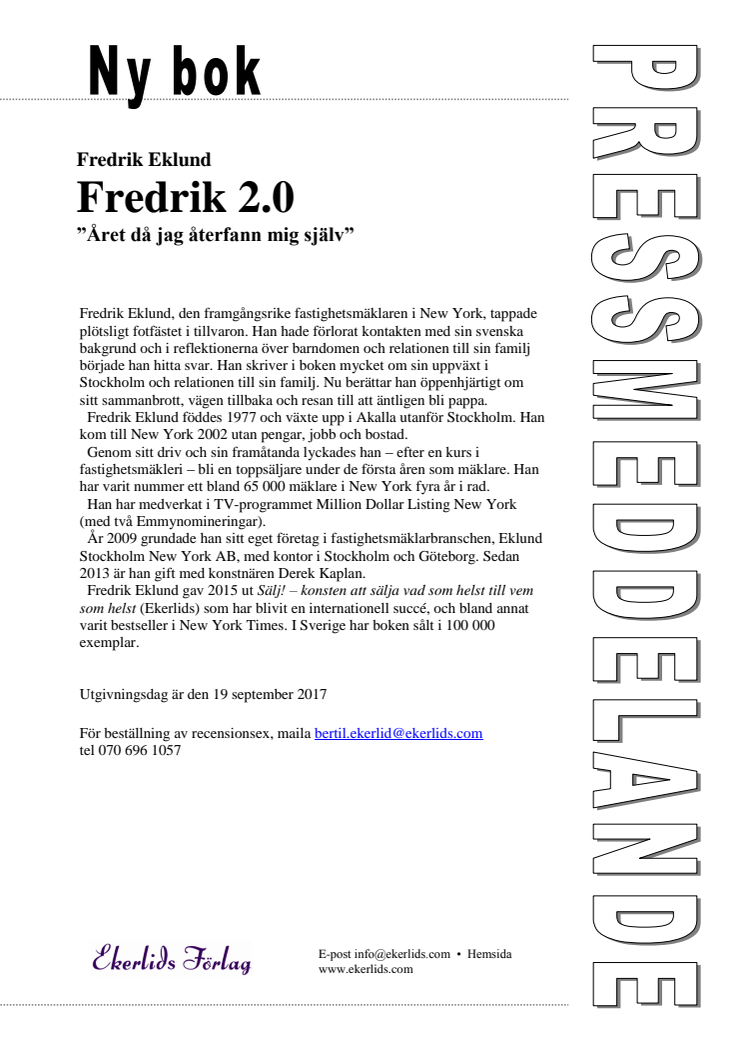 Fredrik Eklund, den framgångsrike fastighetsmäklaren i New York, tappade plötsligt fotfästet i tillvaron. Han skriver i boken Fredrik 2.0 "Året då jag återfann mig själv!" om sin uppväxt i Stockholm och relationen till sin familj. Nu berättar han öppenhjärtigt om sitt sammanbrott, vägen tillbaka och resan till att äntligen bli pappa.