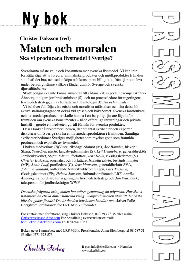 Vi behöver fullfölja våra etiska och moraliska utfästelser och låta dessa bli aktiva ställningstaganden. Svenska lantbrukare och livsmedelsproducenter skulle hamna i ett betydligt ljusare läge inför framtiden om svenska konsumenter gjorde en medveten gir till förmån för svenska produkter, det är tankegångar som förs fram i antologin Maten och Moralen - ska vi producera livsmedel i Sverige?