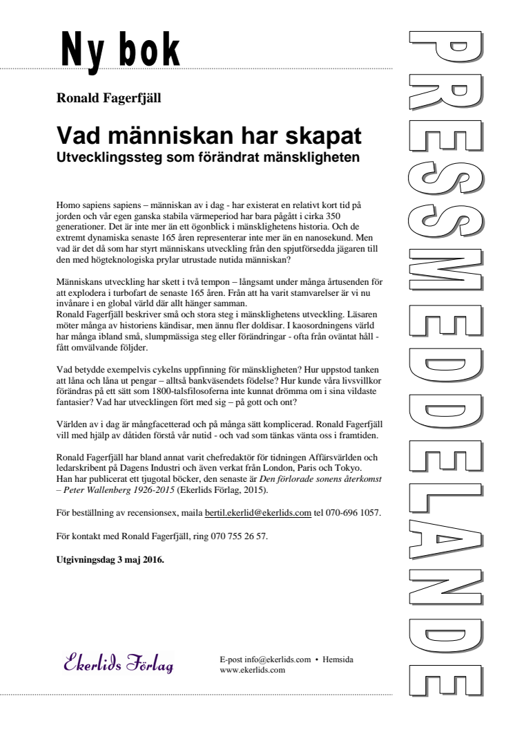 Ny bok: Vad människan har skapat - utvecklingssteg som förändrat mänskligheten av Ronald Fagerfjäll