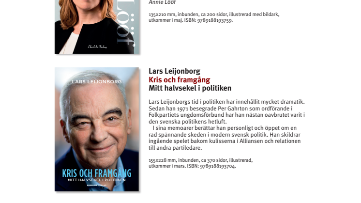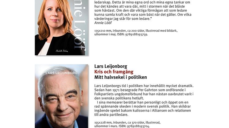 Böcker av eller om Annie Lööf, Lars Leijonborg, Birgit Nilsson, Larry Leksell och Lars Wohlin i vårutgivningen