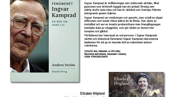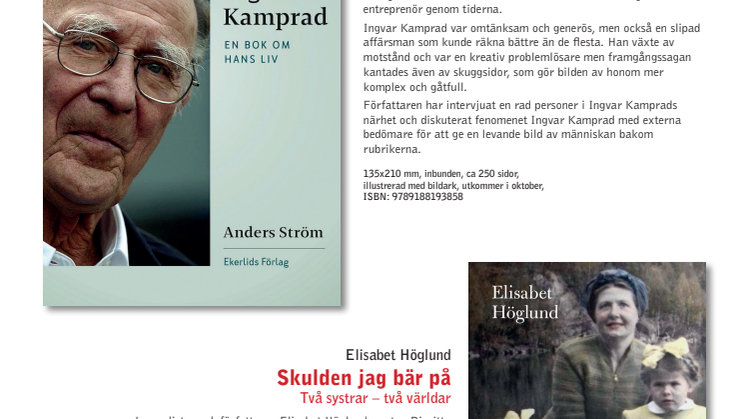 Biografi om Ingvar Kamprad och Elisabet Höglund om sin okända syster bland Ekerlids Förlags höstutgivning