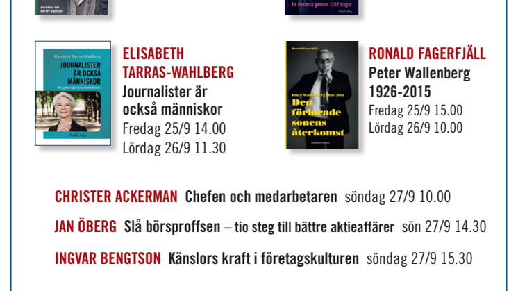 Under bokmässan i Göteborg kommer nedanstående författare att medverka vid monteraktiviteter och seminarier. Bifogar info om framträdanden i montern. För seminarier, se mässprogrammet. Monter B05:27. För bokning av intervju med någon av författarna, maila bertil.ekerlid@ekerlids.com eller ring 070-696 10 57.