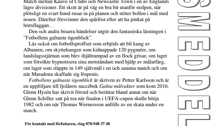 Fotbollens galnaste ögonblick är skriven av Petter Karlsson och är en uppföljare till fjolårets succébok Galna målvakter. Glenn Hysén har skrivit förord till boken om sina galna ögonblick i IFK Göteborg och klubbar ute i Europa.