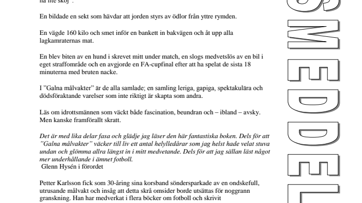Det är med lika delar fasa och glädje jag läser den här fantastiska boken. Dels för att ”Galna målvakter” väcker till liv ett antal helylledårar som jag helst hade velat stuva undan och glömma allra längst in i mitt medvetande. Dels för att jag sällan läst något mer underhållande i ämnet fotboll.