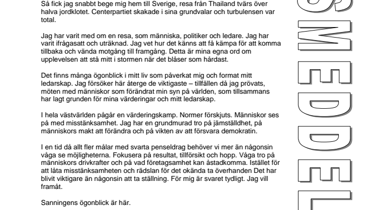 Så fick jag snabbt bege mig hem till Sverige, resa från Thailand tvärs över halva jordklotet. Centerpartiet skakade i sina grundvalar och turbulensen var total.