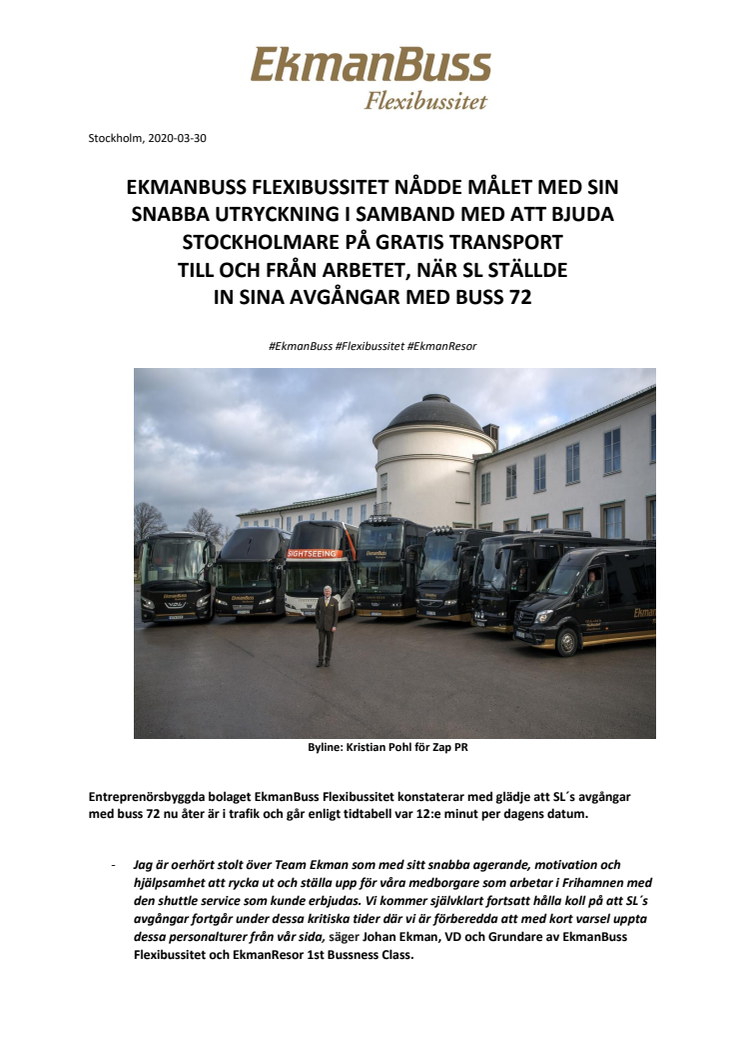 EKMANBUSS FLEXIBUSSITET NÅDDE MÅLET MED SIN SNABBA UTRYCKNING I SAMBAND MED ATT BJUDA STOCKHOLMARE PÅ GRATIS TRANSPORT TILL OCH FRÅN ARBETET, NÄR SL STÄLLDE IN SINA AVGÅNGAR MED BUSS 72