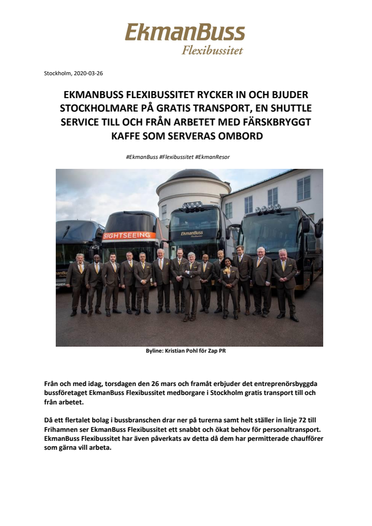 Från och med idag, torsdagen den 26 mars och framåt erbjuder det entreprenörsbyggda bussföretaget EkmanBuss Flexibussitet medborgare i Stockholm gratis transport till och från arbetet.