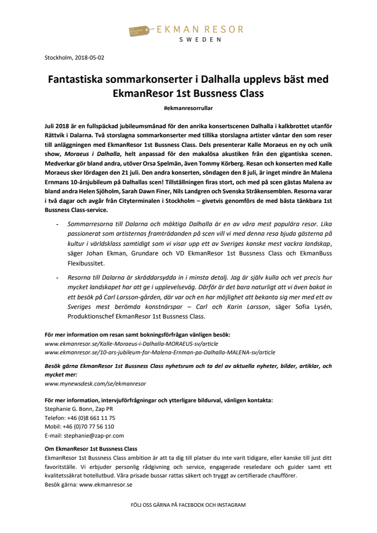 Juli 2018 är en fullspäckad jubileumsmånad för den anrika konsertscenen Dalhalla i kalkbrottet utanför Rättvik i Dalarna. Två storslagna sommarkonserter med tillika storslagna artister väntar den som reser till anläggningen med EkmanResor 1st Bussness Class.