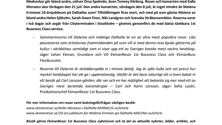 - Sommarresorna till Dalarna och mäktiga Dalhalla är en av våra mest populära resor. Lika passionerat som artisternas framträdanden på scen vill vi med denna resa bjuda gästerna på kultur i världsklass samtidigt som vi visar upp ett av Sveriges kanske mest vackra landskap, säger Johan Ekman, Grundare och VD EkmanResor 1st Bussness Class och EkmanBuss Flexibussitet.
