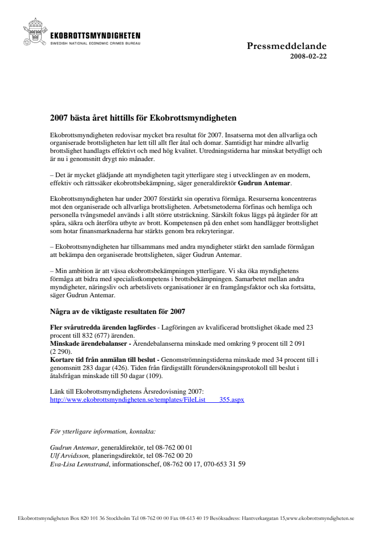 Ekobrottsmyndigheten redovisar mycket bra resultat för 2007. Insatserna mot den allvarliga och organiserade brottsligheten har lett till allt fler åtal och domar. Samtidigt har mindre allvarlig brottslighet handlagts effektivt och med hög kvalitet. Utredningstiderna har minskat betydligt och är nu i genomsnitt drygt nio månader.