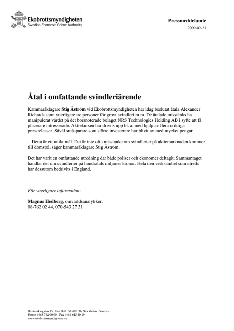 Kammaråklagare Stig Åström vid Ekobrottsmyndigheten har idag beslutat åtala Alexander Richards samt ytterligare tre personer för grovt svindleri m.m.